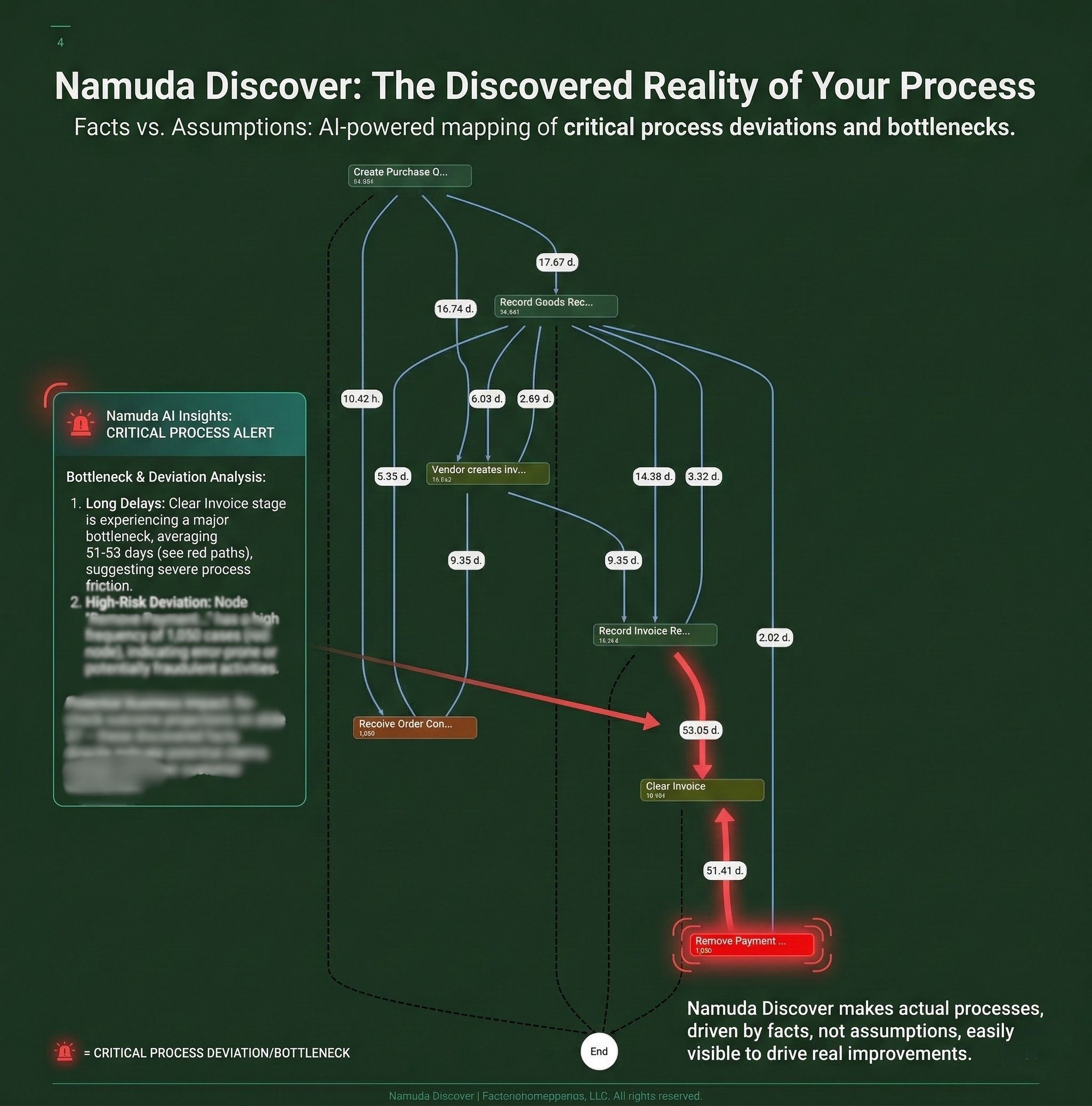Using data mining techniques such as process mining, the real process is visualized as it truly operates — not as it was designed.